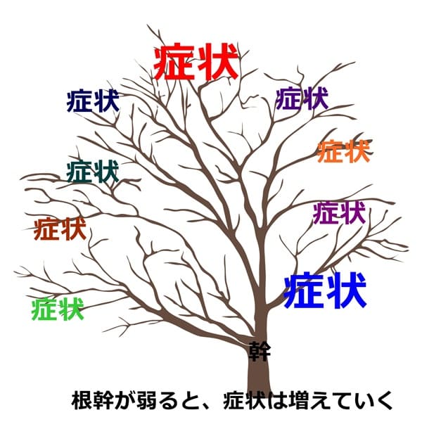 人間の体も同様に、体の根幹の部分が弱ってくると、様々な偏りがでてきて「症状」という枝葉がでてきます。